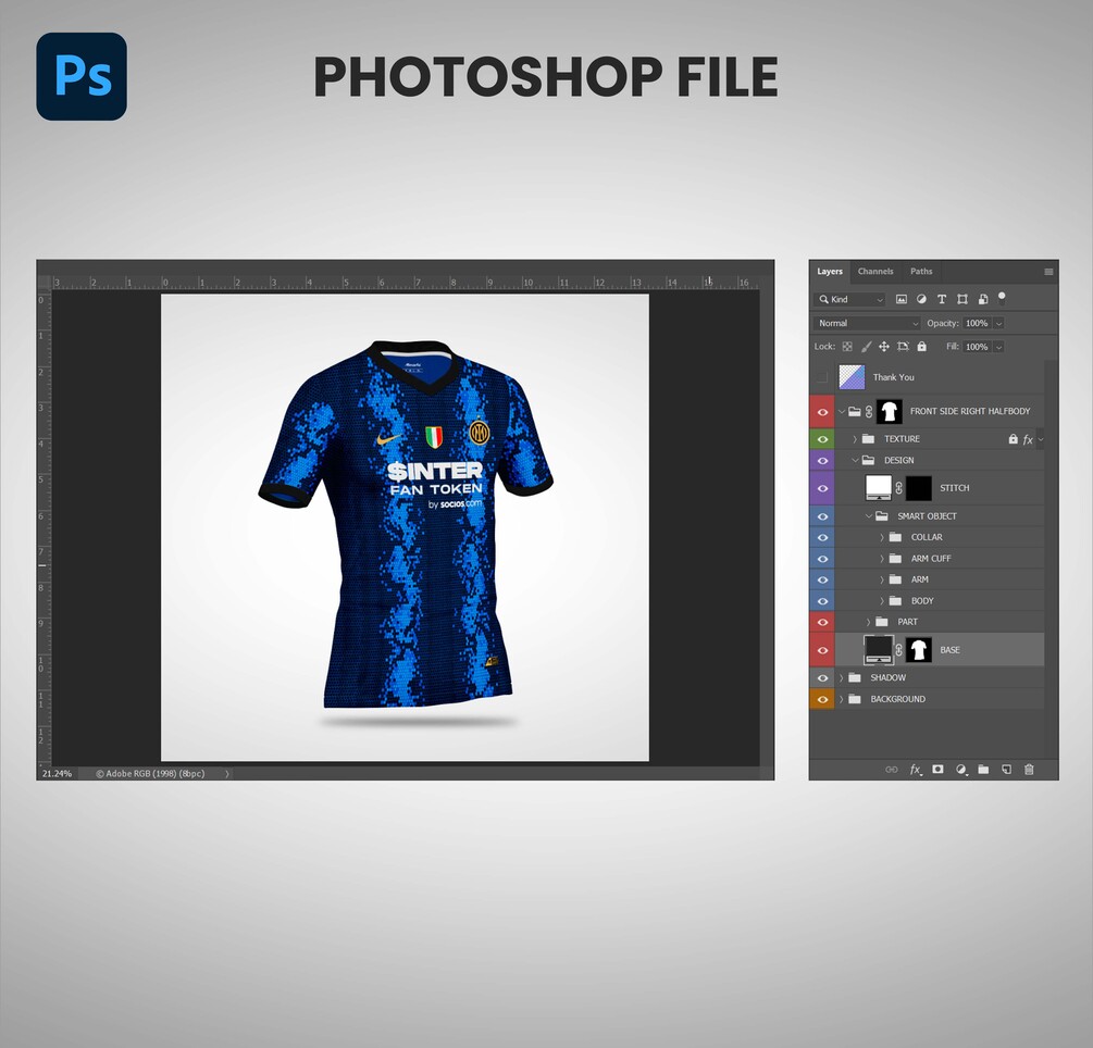 You'll get HD premium quality football kit mockup with reachable price. This mockup made with Photoshop CC 2019. Minimum requirement : Photoshop CS 5 - Photoshop CC 2019